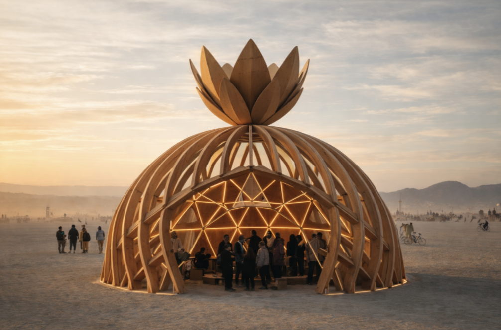 A large-scale dome crowned by a blooming form. The Dome is designed as a place of gathering — a structure that can be entered, inhabited, and experienced from within. More accessible in its fabrication threshold than the Whale.