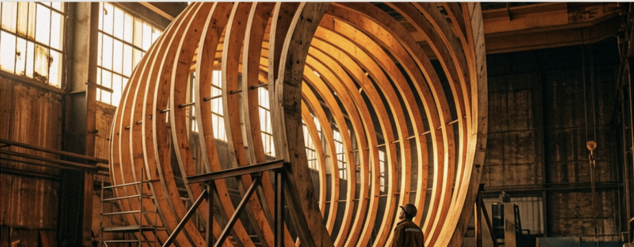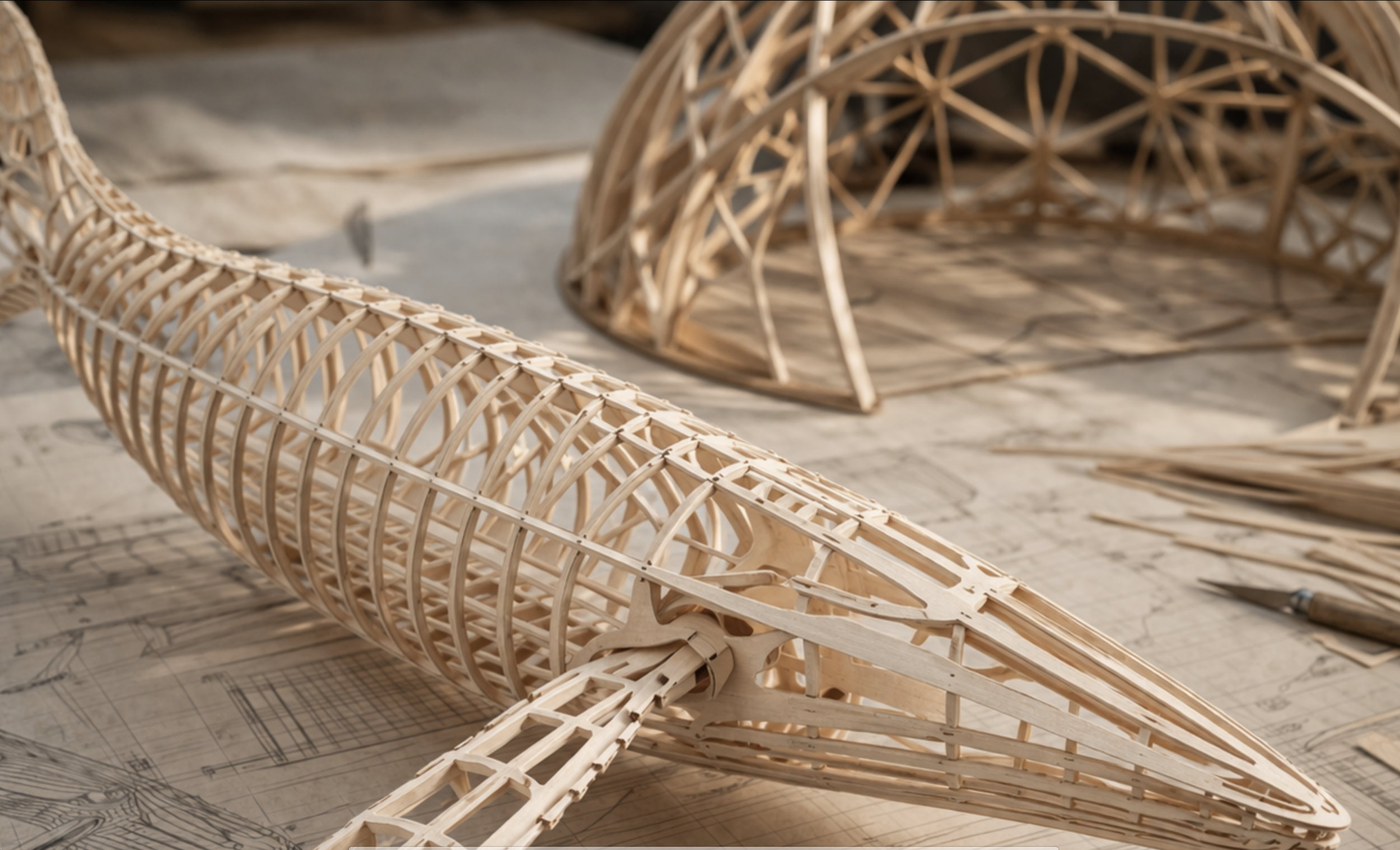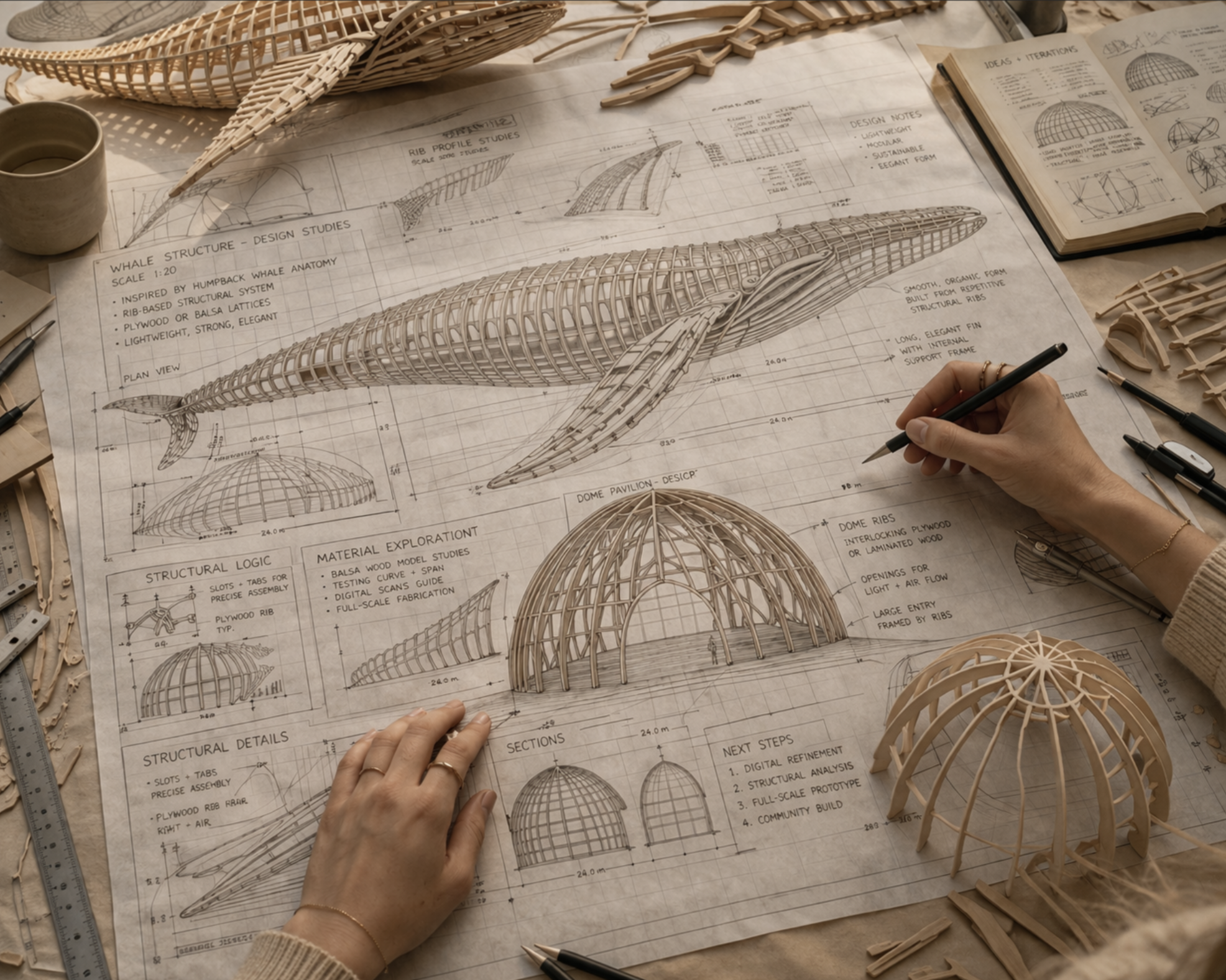 A large-scale structure designed at 10 to 15 metres in length. Conceived as a semi-monocoque rib system — a structure that reveals its own internal logic through frames, stringers, and spacing. Both sculptural and inhabitable in its presence.